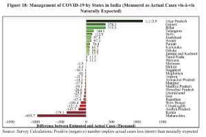आर्थिक सर्वेक्षणात बाधित रुग्णांच्या अपेक्षित संख्येत आणि प्रत्यक्ष बाधितांच्या आकडेवारीत उत्तर प्रदेश, गुजरात, बिहार, तेलंगणा आणि दिल्ली या राज्यांच्या कामगिरी अव्वल दर्जाची राहिली आहे. महाराष्ट्राच्या बाबत जवळपास -९५६ इतकी भयंकर तफावत आढळली. म्हणजे अंदाजीत रुग्णांपेक्षा बाधितांची संख्या साधारणपणे ९५६ ने जास्त होती. याच क्रमवारीत उत्तम कामगिरीसह योगी आदित्यनाथांचे उत्तर प्रदेश सरकार अव्वल स्थानावर आहे. उत्तर प्रदेशात ही तफावत जवळपास १,११४ इतकी आहे. याचा अर्थ अंदाजीत रुग्णांपेक्षा प्रत्यक्ष बाधितांची संख्या साधारणपणे १,११४ ने कमी राहिली आहे.